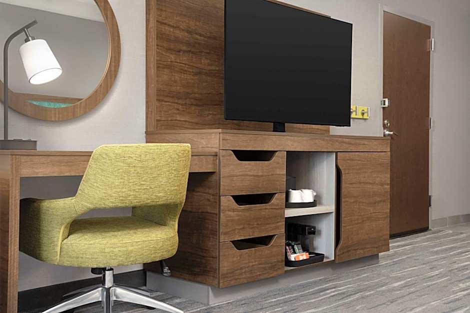 This room has a flat-screen TV, refrigerator, and coffee machine.